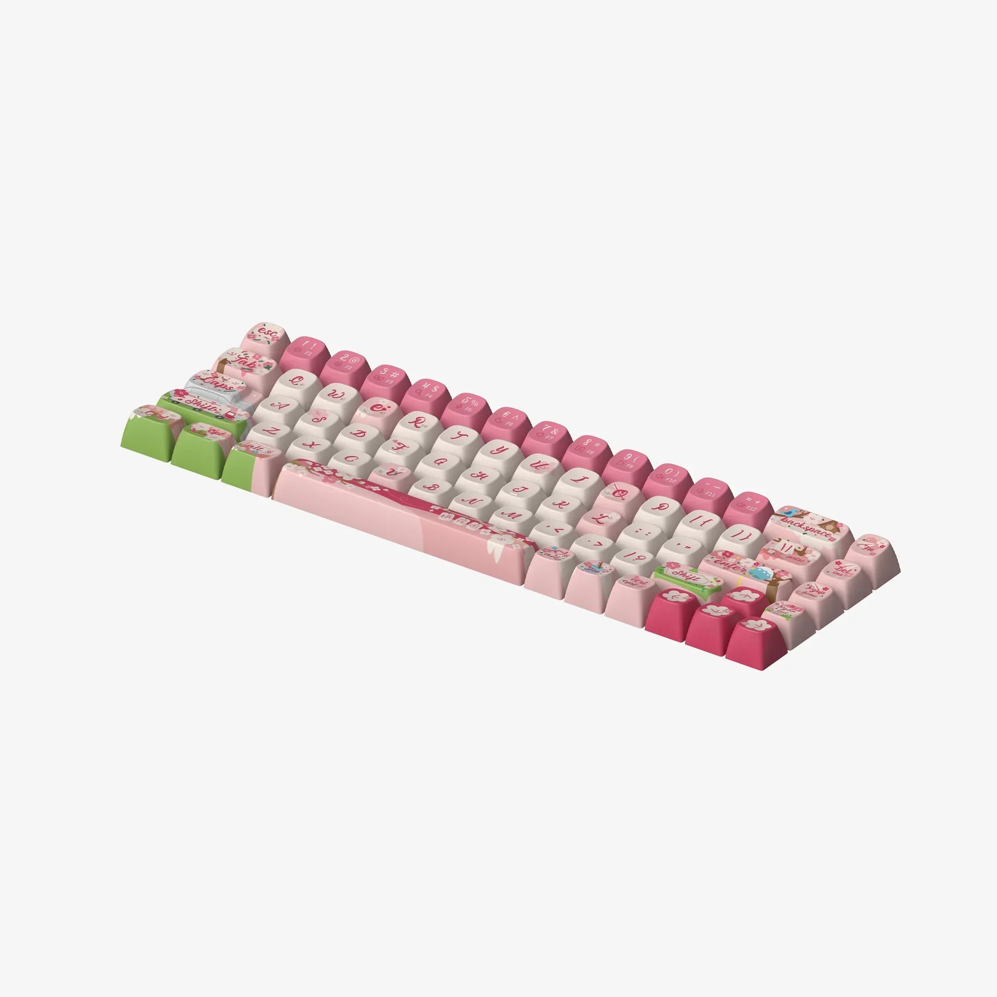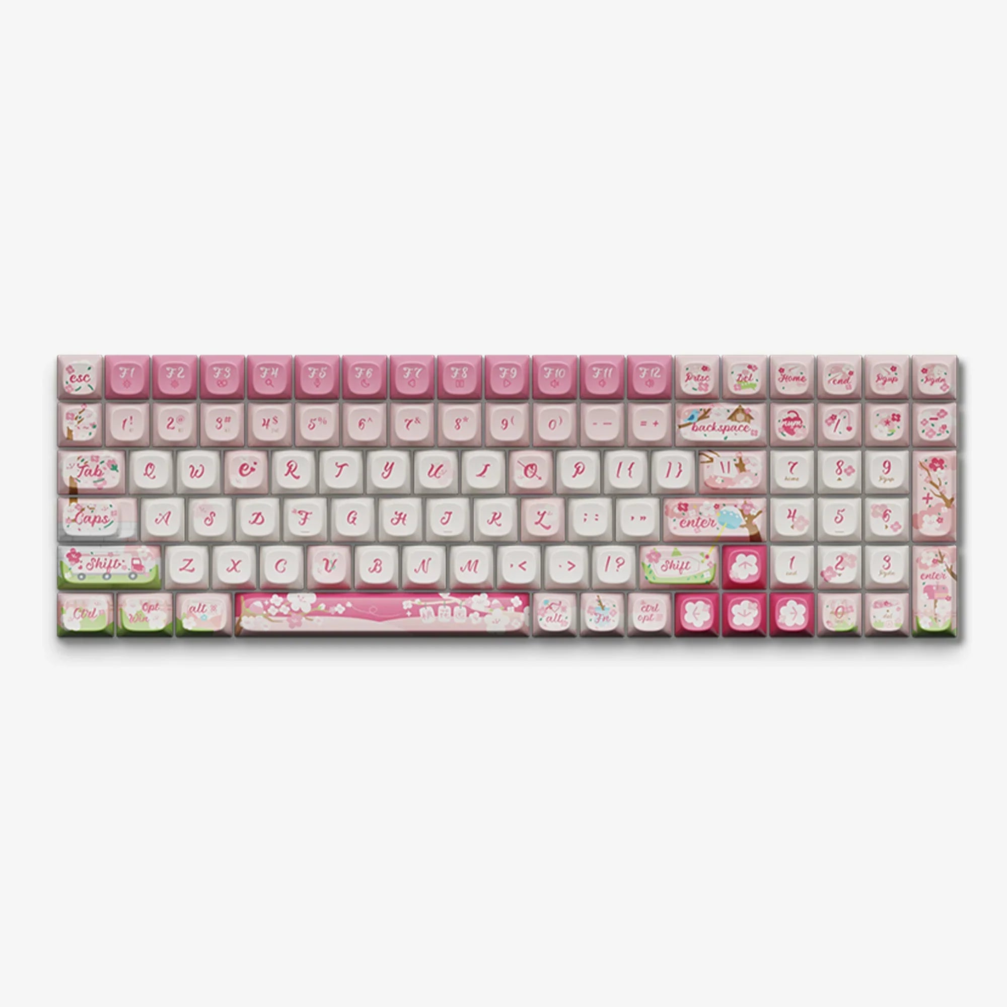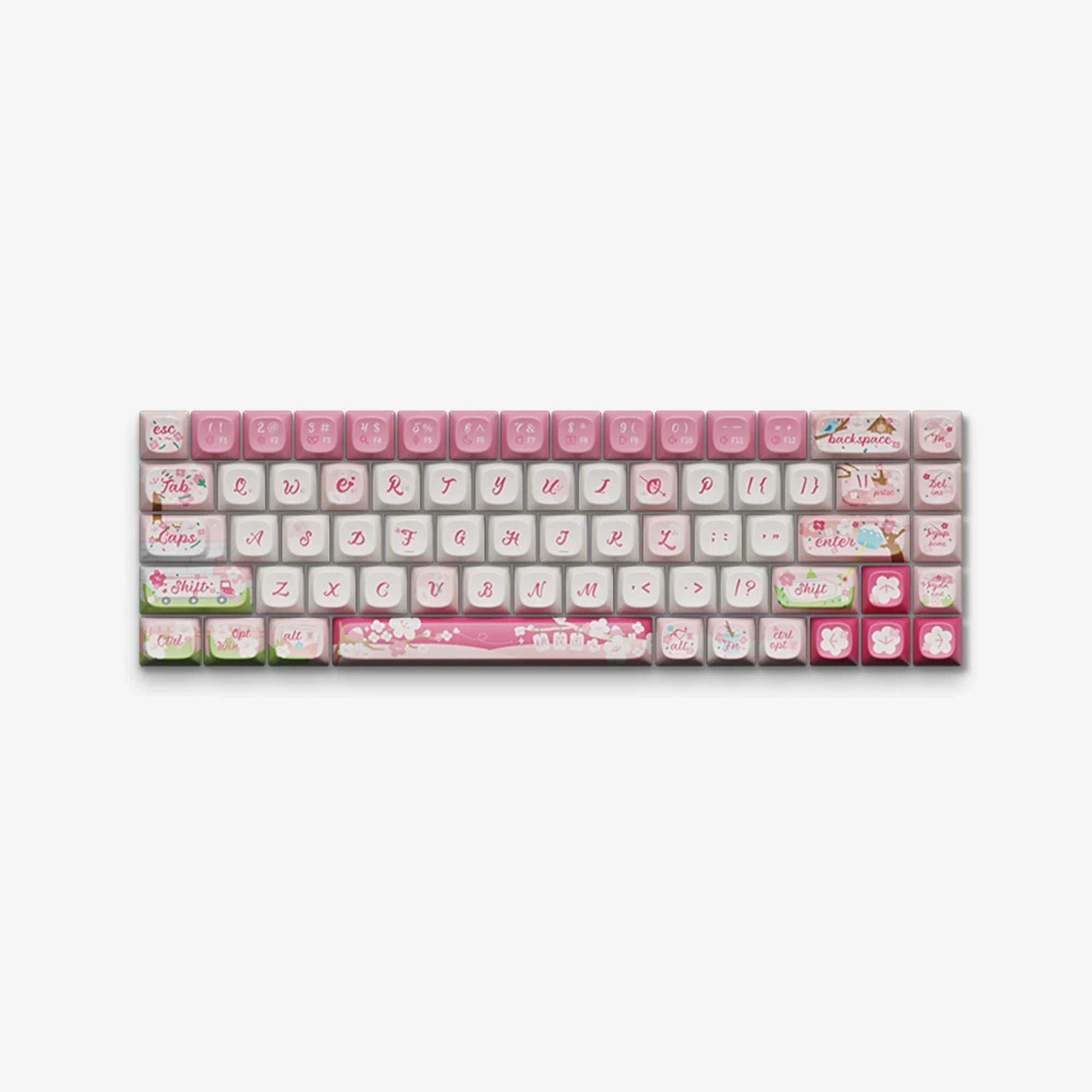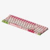 Inspired by the enchanting peach blossoms, a symbol of thriving romance in Chinese culture, our "Blossom Love" keycaps make every keystroke a step towards love. The Shift key features a truck brimming with blossoms, symbolizing love’s imminent arrival. Cupid’s arrows poised on the Alt keys and a love letter further invite romance. The Enter key’s wind chime under a peach tree sways with wishes for love, while pink hues of spring express a yearning for pure affection, making this set a poetic celebration of love's blossoming promise.
