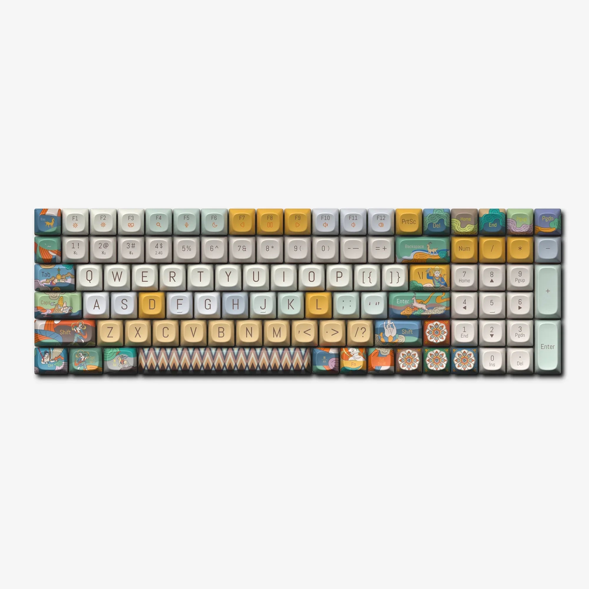 Celebrate the rich heritage of Dunhuang art with our “Splendid Dunhuang” keycaps, a magnificent tapestry of religious and cultural expressions. The art reflects a fusion of Buddhist religious themes with Chinese, Indian, and Persian influences, showcasing a vibrant exchange of ideas and aesthetics along the Silk Road. These designs merge a fusion of Buddhist religious themes with Chinese, Indian, and Persian influences Dunhuang art. This set of keycaps showcases the historical depth and aesthetic beauty of Buddhist art from Dunhuang Art, making every keystroke a connection to ancient artistic excellence.
