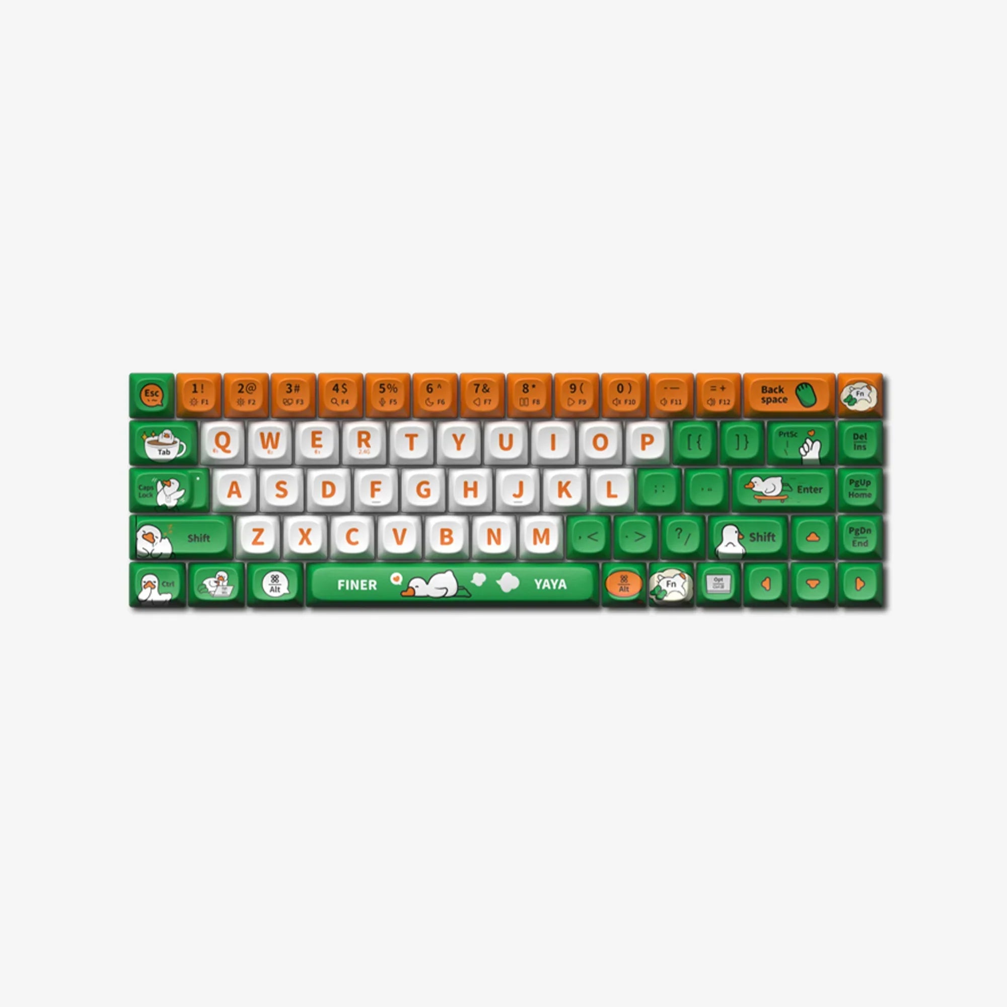 Brighten your keyboard with "Yaya Duck" keycaps, inspired by the whimsical duck from Finerworld, who is the pet of “Finner”. Known for his grumblings yet joyful life with humans, Yaya offers a playful and happy vibe to your daily interactions. Perfect for bringing a bit of joy and humor to your daily typing.